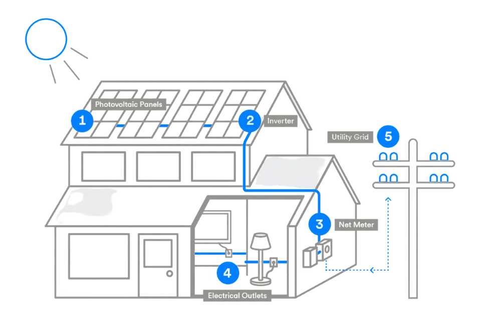 Your newly generated electricity then runs through your net meter to power your appliances. It functions just like electricity would from your utility, but without all of the negative side effects on the environment. Even so, you’ll still be connected to the local grid so you can automatically use traditional power should the need arise. Staying connected to the grid comes with a few advantages, such as potential to share your clean energy and, if you don’t have a solar battery, tapping into traditional energy sources once the sun goes down. Depending on where you live, you might even be given a credit from your utility for sending your extra power to the grid.